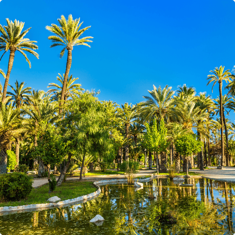 Elche, también conocida como Elx, es una ciudad que realmente hay que visitar cuando se está en España. Es famosa por El Palmeral, el mayor parque de palmeras de Europa, ¡con más de 200.000 palmeras! Este parque no sólo es grande, sino también muy antiguo y está lleno de senderos para pasear, cascadas e incluso zonas de juegos. Es el lugar perfecto para relajarse cuando fuera hace calor. Y lo mejor es que se puede entrar gratis.